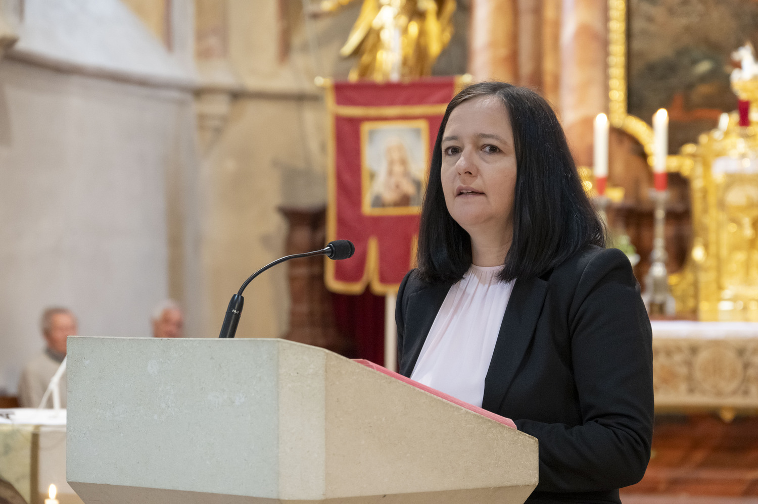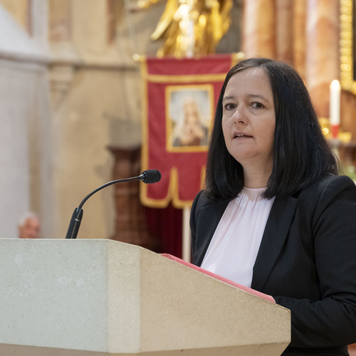 Am Foto: VD Michaela Friewald Erlekotte, VOL Anna Plöchl (Klasse 2A) VOL Martina Hochgerner (Klasse 2B), Pfarrer P. Leonhard, PAss. Willi Erber (links stehend) Bürgermeister Christian Fischer (rechts stehend).