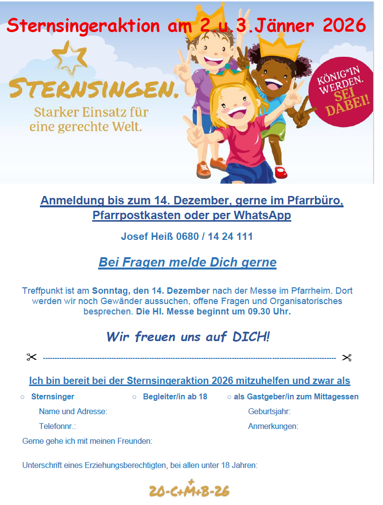 Sternsingeranmeldung Auch 2026 möchten wir die Sternsingeraktion unterstützen. Schon jetzt ein herzliches Dankeschön für das Mitragen der Aktion. Anmeldung zum ausdrucken mehr: Sternsingeranmeldung